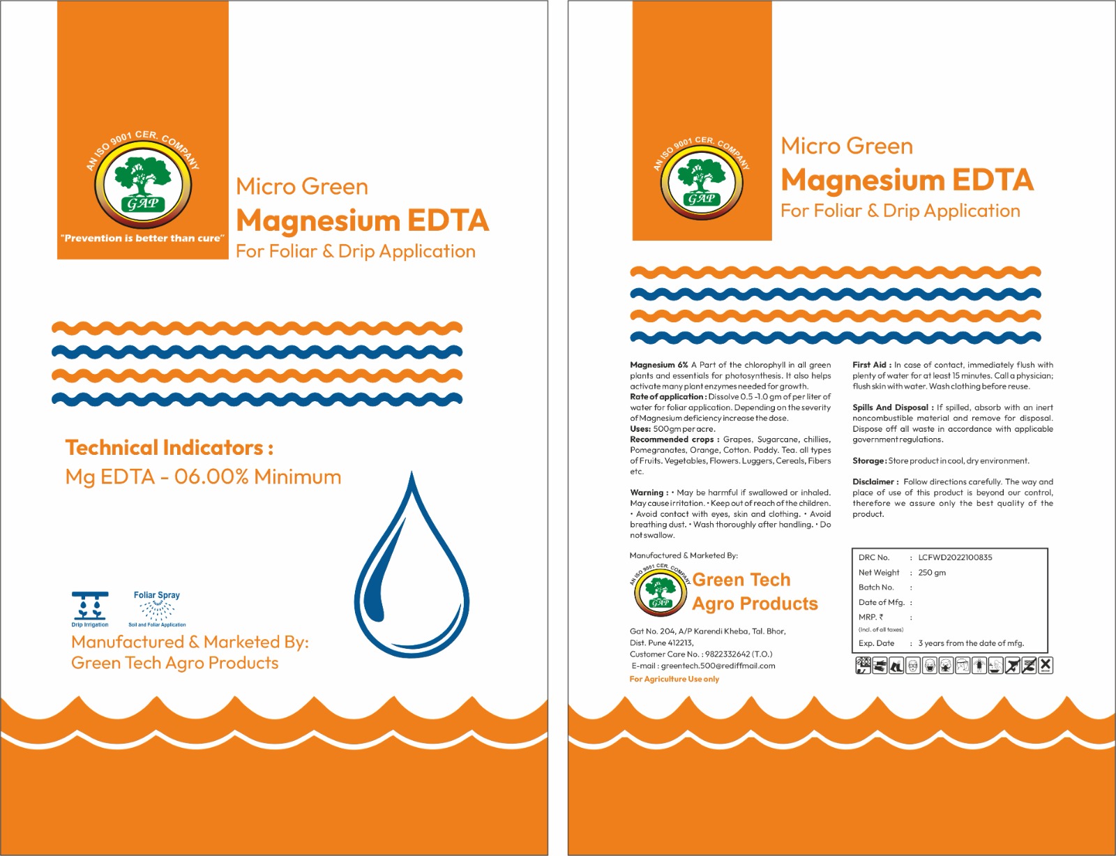 Rate of application: Dissolve 0.5 -1.0gm of per liter of water for foliar application. Depending on the severity of Magnesium deficiency increose the dose.